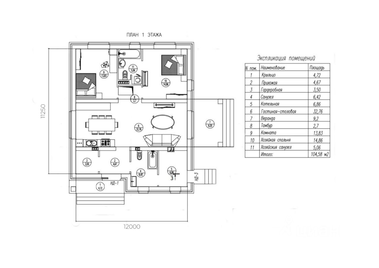 Продается земельный участок 165а со строительным подрядом в коттеджном поселке премиум-класса ''Чистые пруды 3''. Площадь участка 8,28 сот. Стоимость участка указана вместе с типовым проектом дома 104 кв.м. Проект 1-104 это: 104 м2 комфортного пространства для Вас 1 этаж 2 комнаты 2 санузла Просторная кухня-гостиная Фундамент дома — монолитный. Стены сделаны из газосиликатного блока Bonolit с утеплителем и облицовочным кирпичом. Срок строительства дома — ориентировочно 9 месяцев.