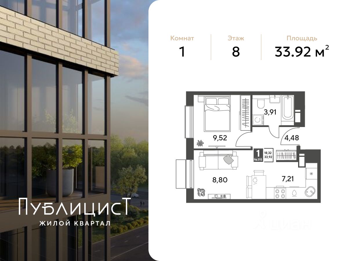 В подмосковном городе Пушкино продается квартира площадью 33.92 кв. м с чистовой отделкой. на 8 этаже 15 этажного дома. Квартира расположена в жилом комплексе ''Публицист'' (девелопер Dogma).