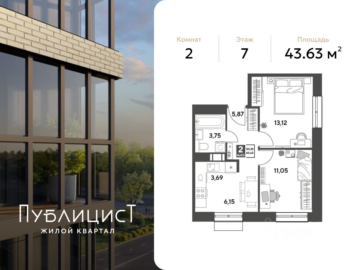 Общая площадь43,63 м2