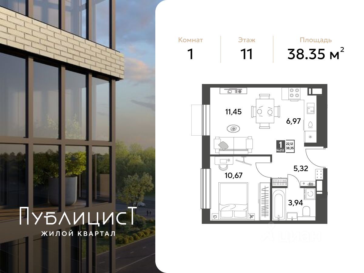 В подмосковном городе Пушкино продается квартира площадью 38.35 кв. м с чистовой отделкой. на 11 этаже 15 этажного дома. Квартира расположена в жилом комплексе ''Публицист'' (девелопер Dogma).