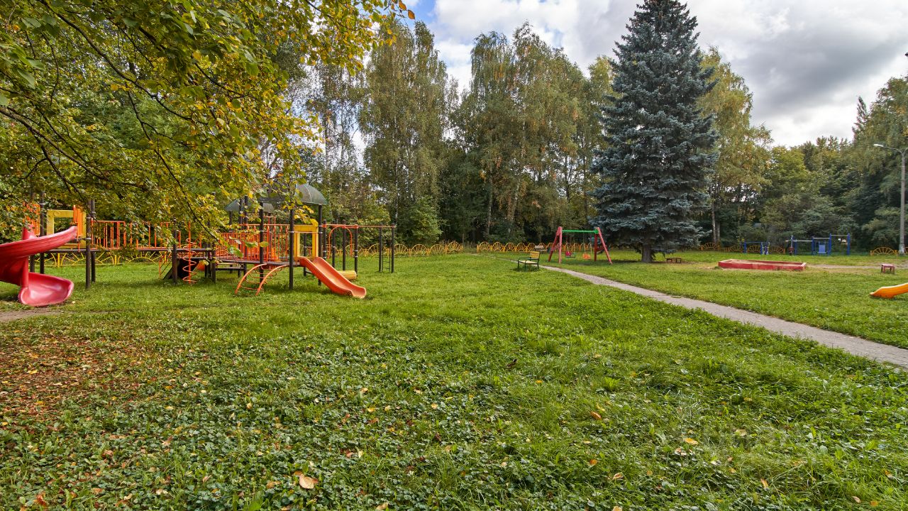 Во дворе дома большая парковка, детская площадка и море зелени.