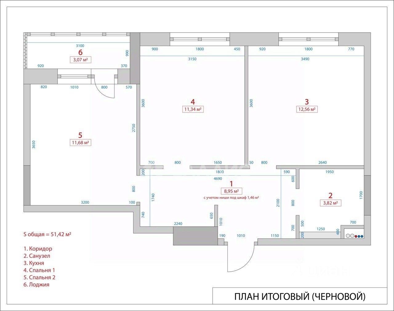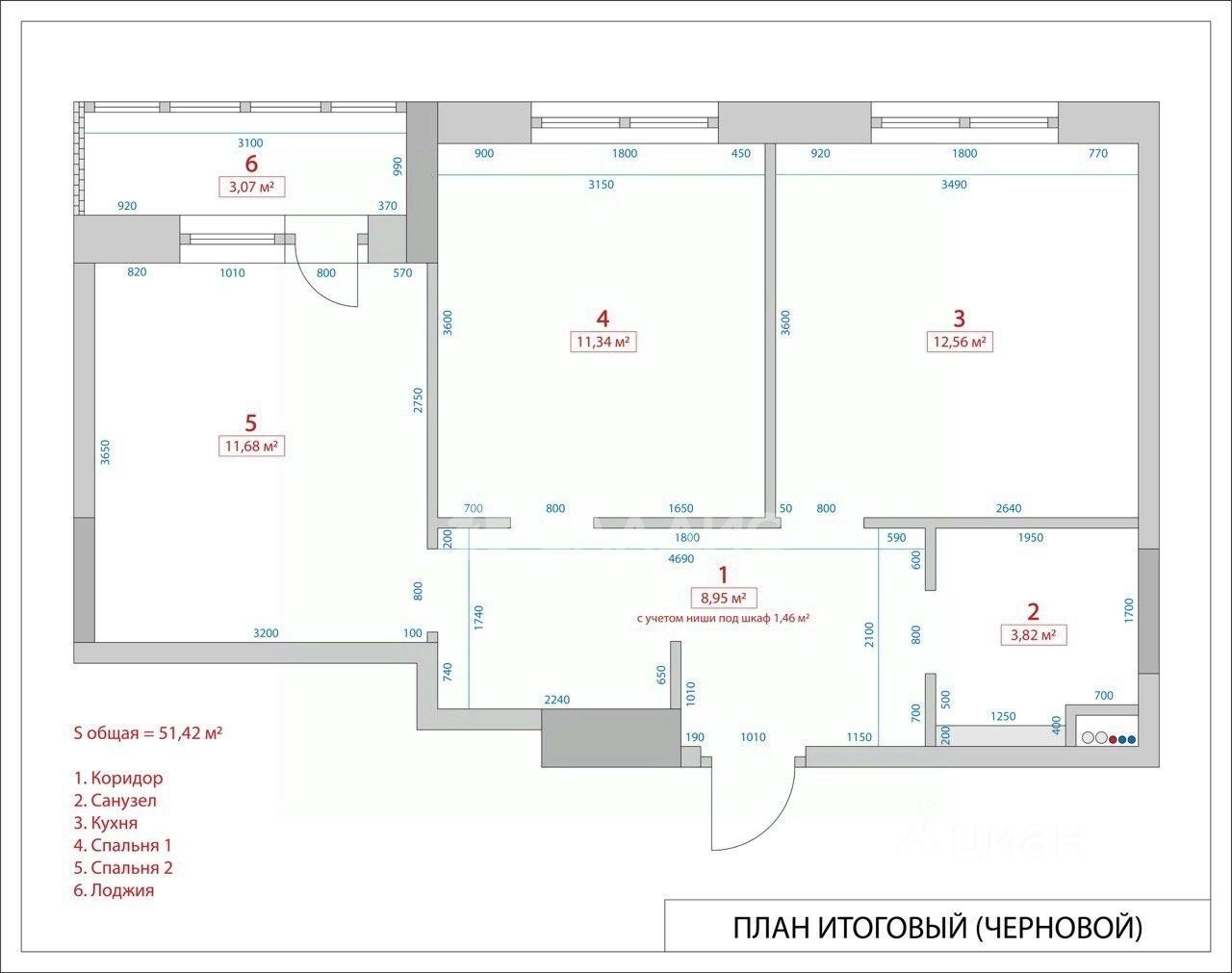 Общая площадь квартиры 51,42 метра (с учетом лоджии 3 метра). Уютная спальня 11,7 метров, детская комната 11,3 метров с выходом на лоджию. Функциональная кухня-столовая - 12,5 метров, просторный коридор с местом для встроенного шкафа, совмещенный санузел.